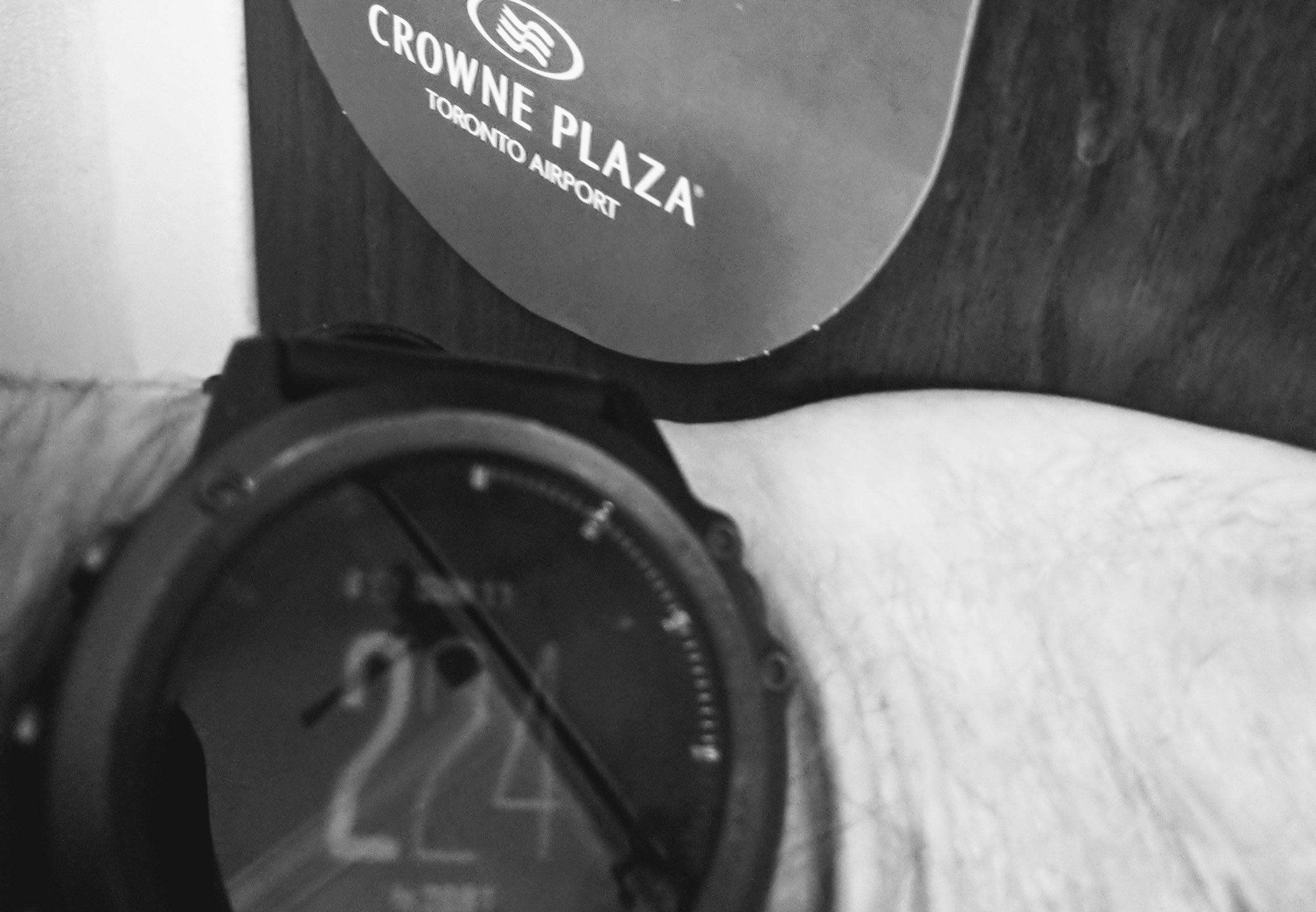 Sun 1230am: Land in Toronto and deplane. Grab new boarding passes, meal and hotel vouchers at end of pedway. Proceed through customs and pick up luggage. Leave terminal to hotel shuttle waiting area for bus to Crowne Plaza Hotel. No room on first bus, catch second one.