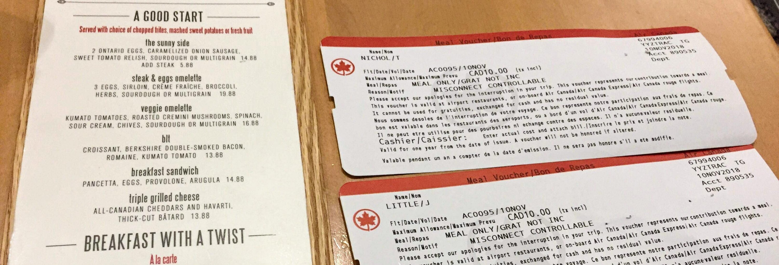 Sat 10:15am: Final four admit not going to make Saturday night connection (Toronto to Halifax at 840pm) and call Air Canada to reschedule on next available flight. Nice AC lady reschedules us on 805am Sunday flight and states a hotel/meal vouchers will be waiting for us in Toronto. Group in okay spirits and feels things will work out.