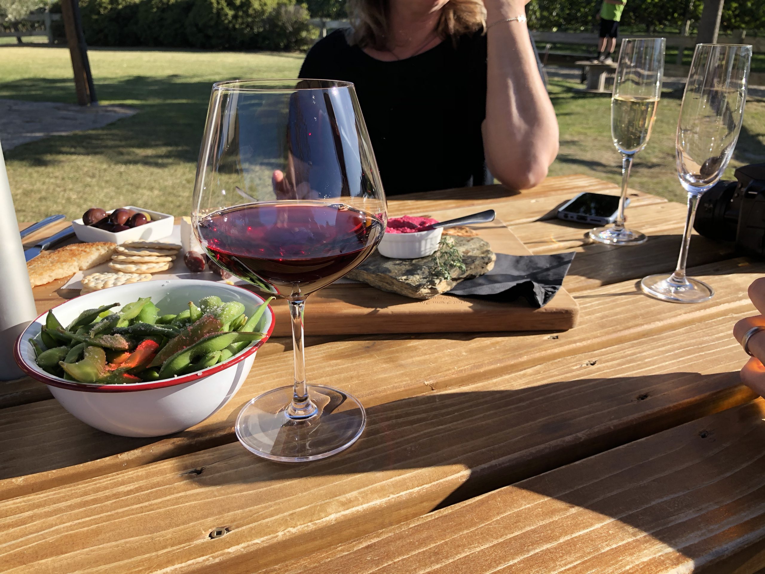 We didn’t make it to all of the 4 Barrels due to time constraints (3/4 ain’t bad!), however we ended our walk back at Scott Base where we toasted with a bubbly wine and shared a charcuterie platter and edamame beans, while Jody did some mobility stretching on the lawn and we shared some laughs! Overall a great “rest day” in Central Otago!