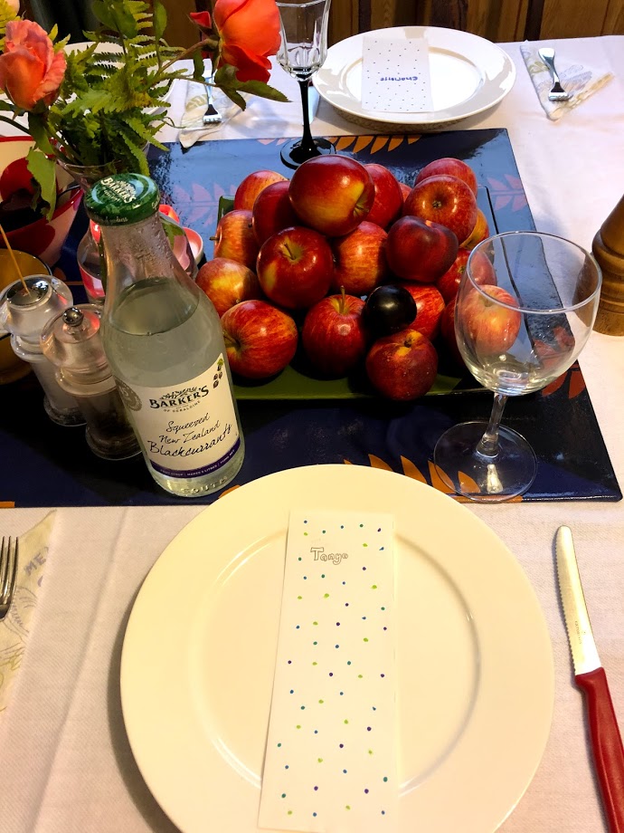 Upon arrival it began to pour rain and the wind picked up. Niccy had lit a fire and we were treated to a lovely supper of salmon, salad fixings fresh from the garden, wine and dessert prepared by Charlotte, complete with place cards (by Charlotte as well). We felt so comforted to finally be here and anxious to explore over the coming days, while still trying to secure flights home.