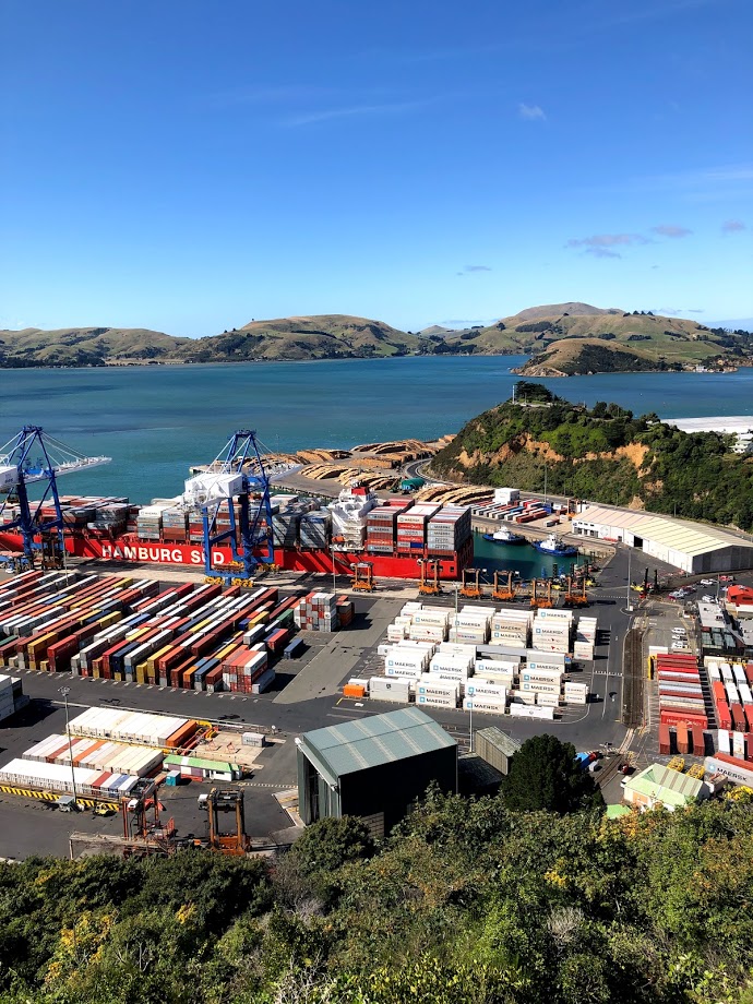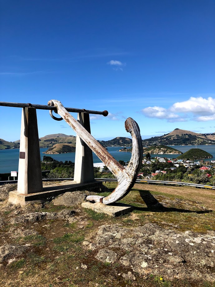 The twisty rural road out of Purakaunui offers amazing views of fields of sheep, old rock walls in the pastures built by Maori warriors, water views, and scrappy, wild chickens on the side of the road! As we drove, Will provided us with local knowledge of the area. We stopped at a great hillside viewpoint of Port Chalmers at a memorial to Captain Scott, whose 1901 and 1910 expeditions departed from the Otago harbour; now the port (typically) is busy with daily cruise ships and container ships docking.
