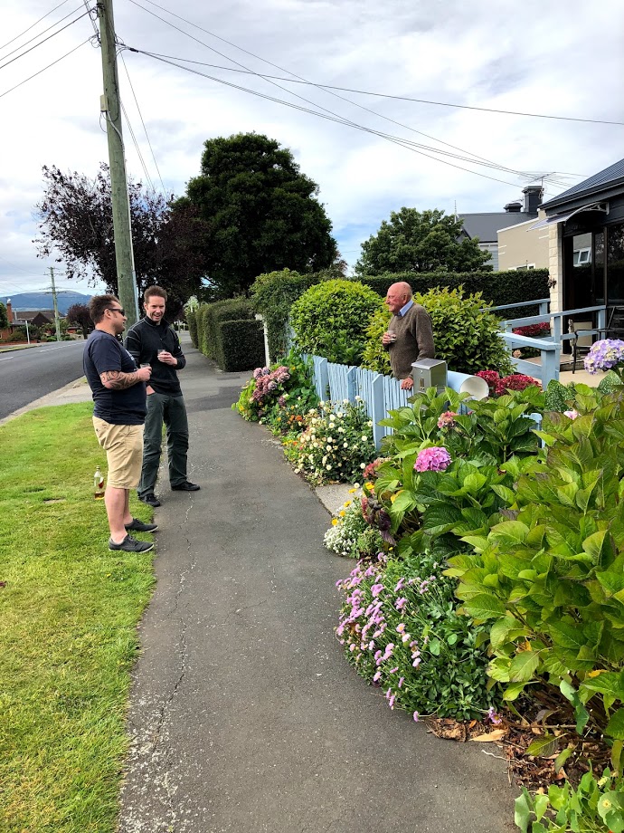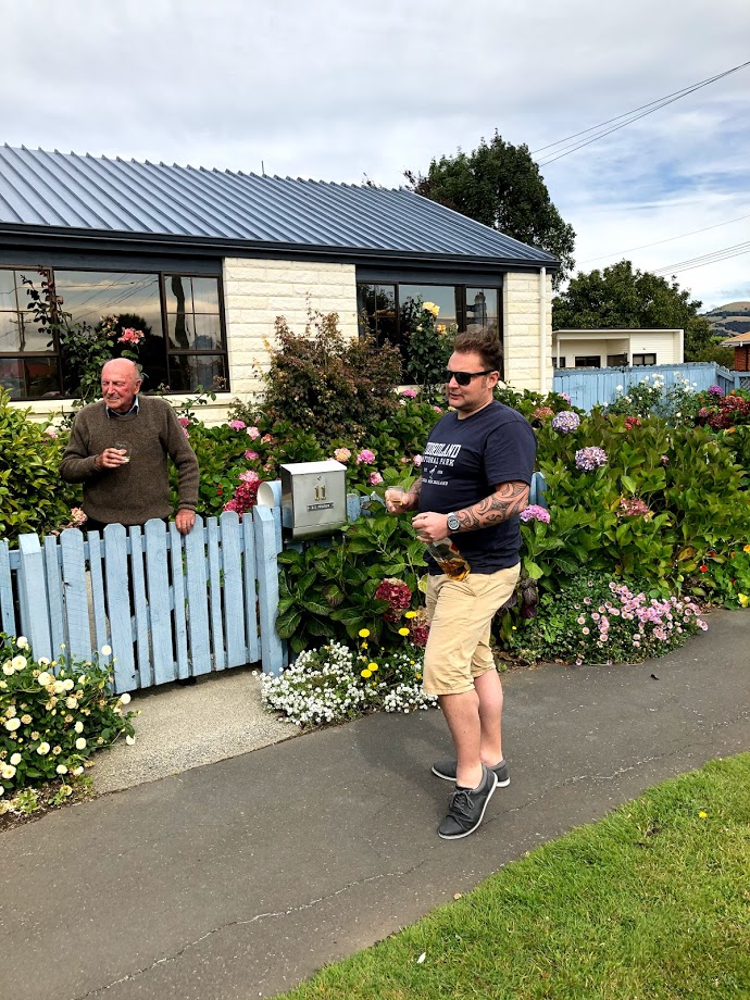 Will’s elderly grandfather, Dave, lives in Mosgiel; so a detour to pay him a visit ensued. Mosgiel is part of Dunedin, but separated from the city by hills. It takes its name from Mossgiel in Ayrshire, the farm of poet Robbie Burns, who was the uncle of one of Dunedin’s founders. Desperate times call for desperate measures, so a glass of whiskey was shared with Dave across the fence (we brought our own whiskey and glasses). What a sweet way to meet him and for Will to wish him well. Dave, a very learned individual, commented on how he was impressed with Jacinda’s (NZ PM) speech as it had no grammatical errors, but he thought that the entire world situation, along with whiskey over the fence, was “disgusting”. 🙂