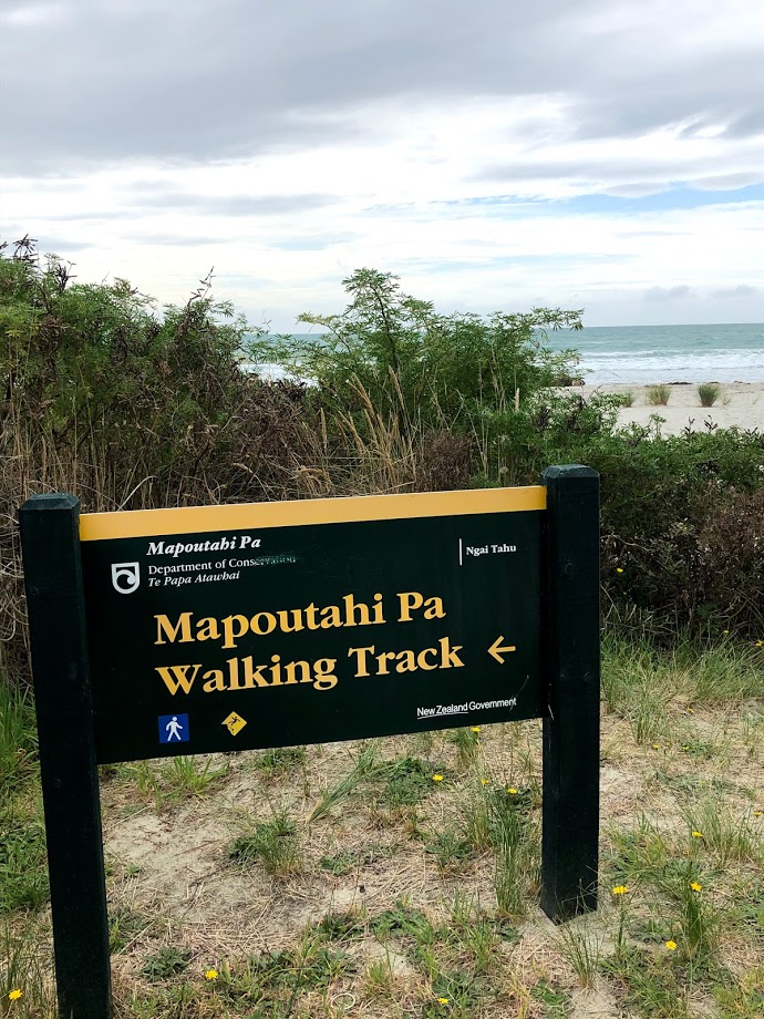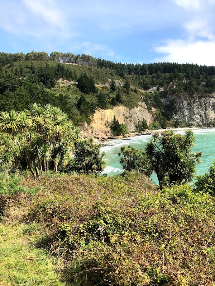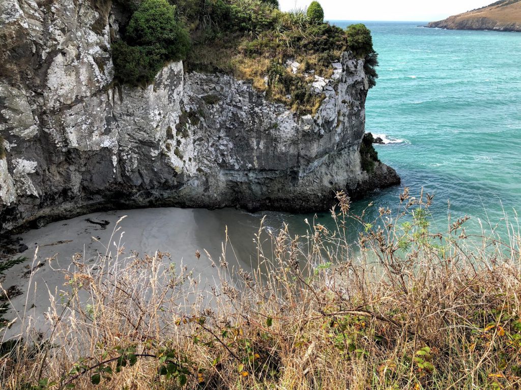 A path led us up a hill to view the headlands surrounding the bay. Mapoutahi Pa was on the left as we walked towards the beach and a path led us to a historic Māori Pa, a village or defensive settlement. The Māori are the indigenous Polynesian people of New Zealand; they originated with settlers from eastern Polynesia, who arrived in New Zealand in several waves of waka (canoe) voyages roughly between 1320 and 1350 (Wikipedia). After a short climb, we were stunned by spectacular views of the coast and steep cliff faces.